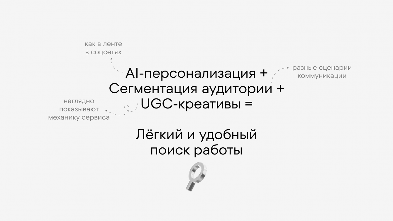 Нужно было не просто объяснить механику AI-ассистента, а сломать привычное восприятие поиска работы и показать, что с AI он становится таким же удобным и быстрым, как персонализированные рекомендации в соцсетях.