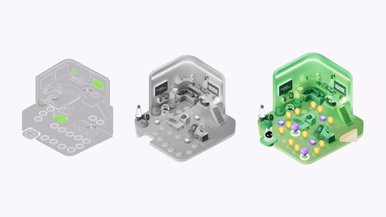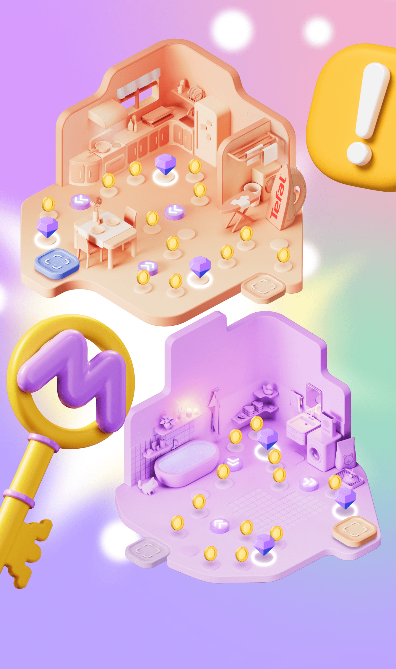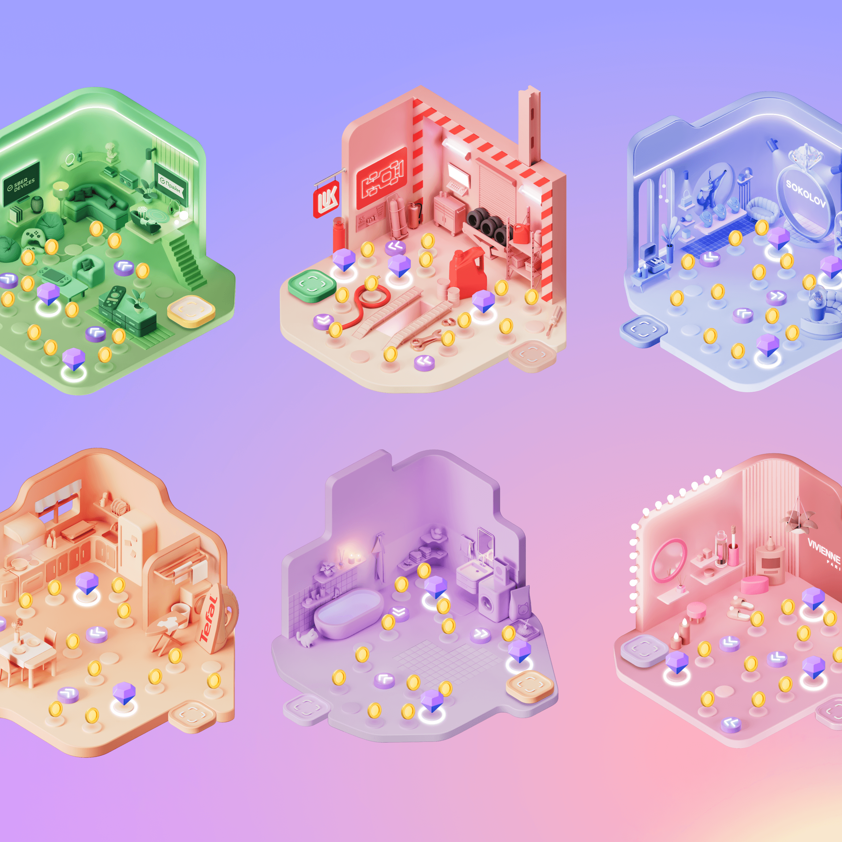 По сценарию игры у нас было несколько этажей: первые два уровня были базовыми, другие — партнерскими: «Лукойл», «СберПрайм», Tefal, Vivienne Sabó, Sokolov и другие. При этом сохранялась и механика, и образ маскота, и стилистика. Чтобы подчеркнуть переход между уровнями, все этажи мы оформили в разной тематике: FMCG, Fashion, «Красота и уход», «Товары для дома», «Электроника», «Авто», «Товары для сада». Для каждого партнерского этажа создали подходящий визуал с деталями, отсылающими к партнерам и оформили комнаты в нужном сеттинге. Так, для Vivienne Sabó отрисовали бьюти-комнату, а для «Лукойл» — гараж и мастерскую.