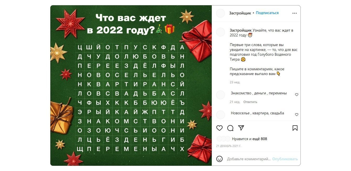 К нам обратился крупный застройщик с запросом на создание развлекательного контента на трех площадках — ВКонтакте, Instagram, Facebook. Работа заключалась в разработке постов и сторис, а также в их дальнейшем продвижении.