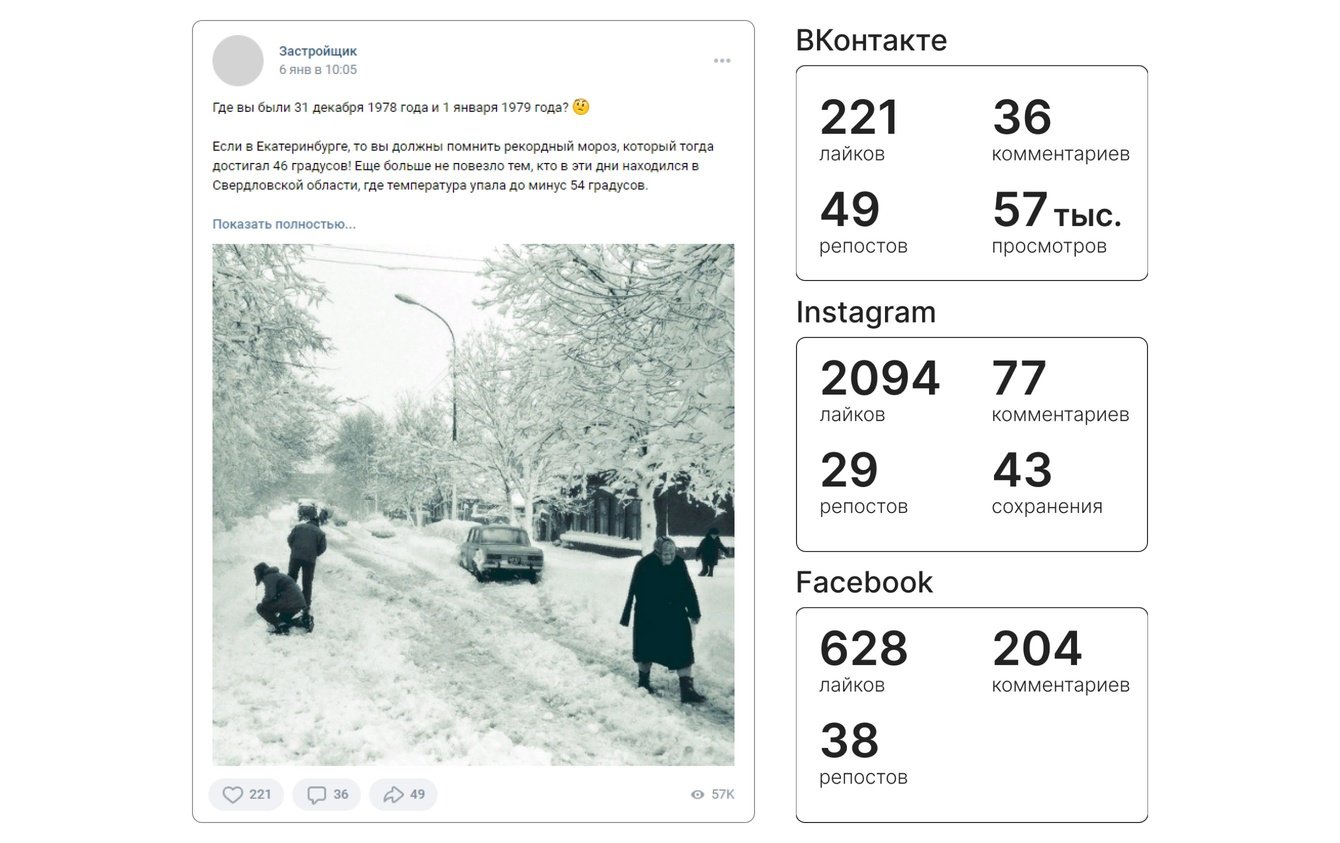 Посты с ностальгическими темами мы чаще всего кросспостили на все площадки. Они набирали большое количество лайков и комментариев. Например, пост про самый холодный день на Урале собрал бурные обсуждения как в ВКонтакте, так и в других соцсетях.