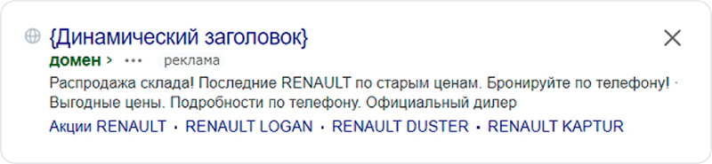 Динамические объявления создаются на основе товарного фида или страниц сайта. Директ анализирует содержание сайта и автоматически формирует запрос под каждый товар и объявление для показа.