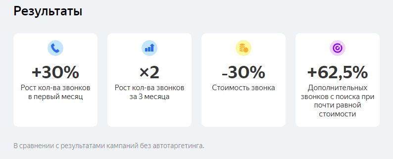 По итогам марта и апреля смарт-баннеры принесли 11% дополнительных звонков с Рекламной сети Яндекса. Стоимость звонка оказалась на 4% выше, чем в кампаниях в РСЯ без смарт-баннеров. В июне результаты стали более значительными: количество дополнительных звонков с рекламной сети выросло на 32%, а звонок подешевел на 15% по сравнению с кампаниями в РСЯ без смарт-баннеров.