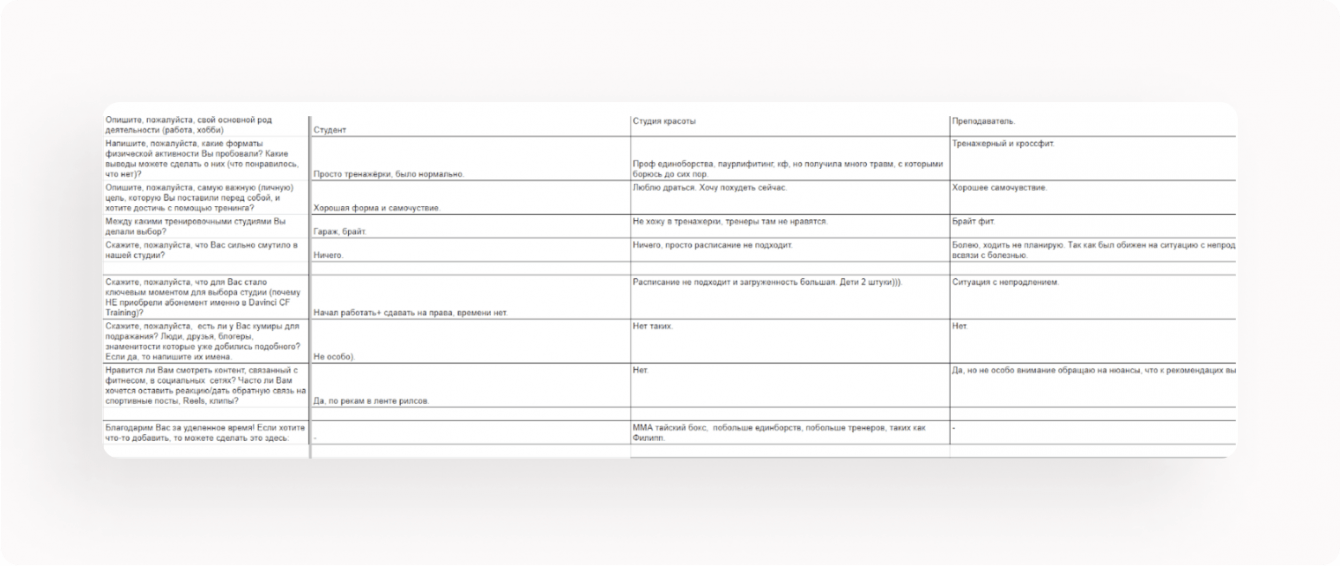 Важность проведения такого CustDev заключается в том, что оно помогло изменить представление заказчика о конкуренции и предпочтениях целевой аудитории. Изначально, заказчик считал, что их студию сравнивают только с аналогичными студиями CrossFit и группового активного фитнеса. Однако, опрос показал, что ключевая целевая аудитория сравнивает тренировки CF Training с тренировками в тренажерном зале, включая самостоятельные тренировки и тренировки с персональным тренером. И в большинстве случаев студия заказчика выигрывает благодаря сочетанию доступности абонемента по цене тренажерного зала, дружеской атмосферы на тренировках и консультированию тренера при занятиях в группе.