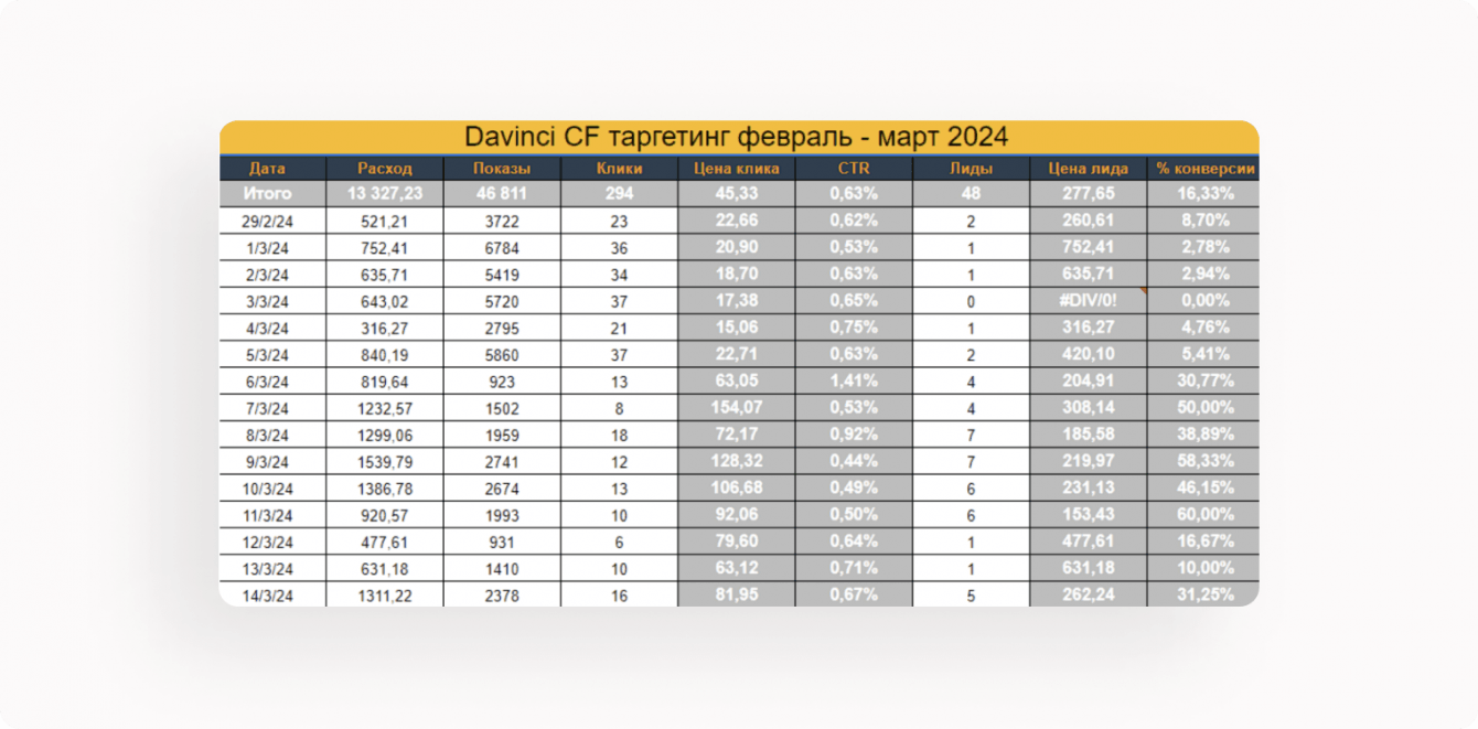 В результате нашей работы, студия Davinci CF Training смогла получать заявки по среднерыночной цене 600 рублей со средней конверсией от 30%. Это привело к увеличению выручки и привлечению новых клиентов, что подтверждает эффективность нашей стратегии таргетированной рекламы.В дальнейшем, после успешного запуска, для достижения максимальной эффективности в рекламных кампаниях для студии Davinci CF Training, мы применили персонализированный подход, учитывая особенности и потребности целевой аудитории.