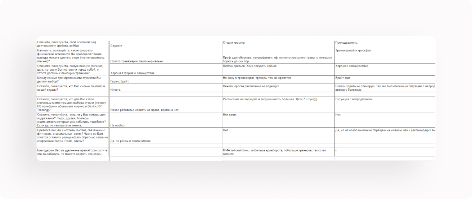 Важность проведения такого CustDev заключается в том, что оно помогло изменить представление заказчика о конкуренции и предпочтениях целевой аудитории. Изначально, заказчик считал, что их студию сравнивают только с аналогичными студиями CrossFit и группового активного фитнеса. Однако, опрос показал, что ключевая целевая аудитория сравнивает тренировки CF Training с тренировками в тренажерном зале, включая самостоятельные тренировки и тренировки с персональным тренером. И в большинстве случаев студия заказчика выигрывает благодаря сочетанию доступности абонемента по цене тренажерного зала, дружеской атмосферы на тренировках и консультированию тренера при занятиях в группе.