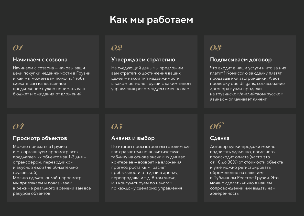 Проект – Консалтинговое агентство, специализирующееся на инвестициях в элитную недвижимость Грузии. Консультанты подбирают ликвидные объекты для инвестиций и жизни и помогают проводить сделки.