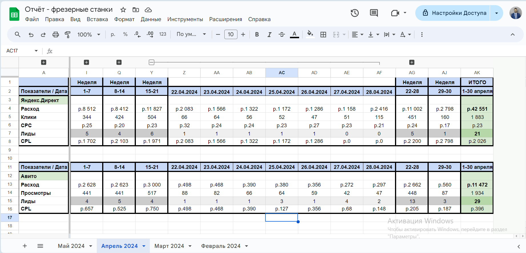 Таблица учитывает 2 канала трафика - Яндекс.Директ и Авито.
