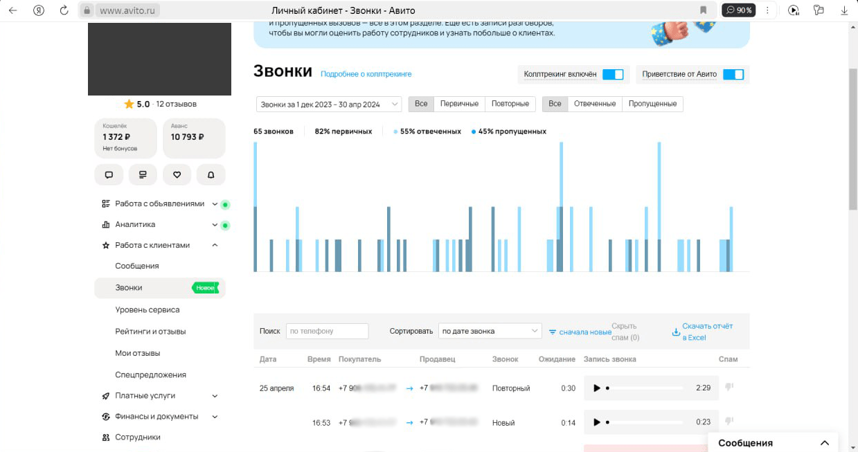Ниже можно посмотреть запросы клиентов и отчет по звонкам с Авито: