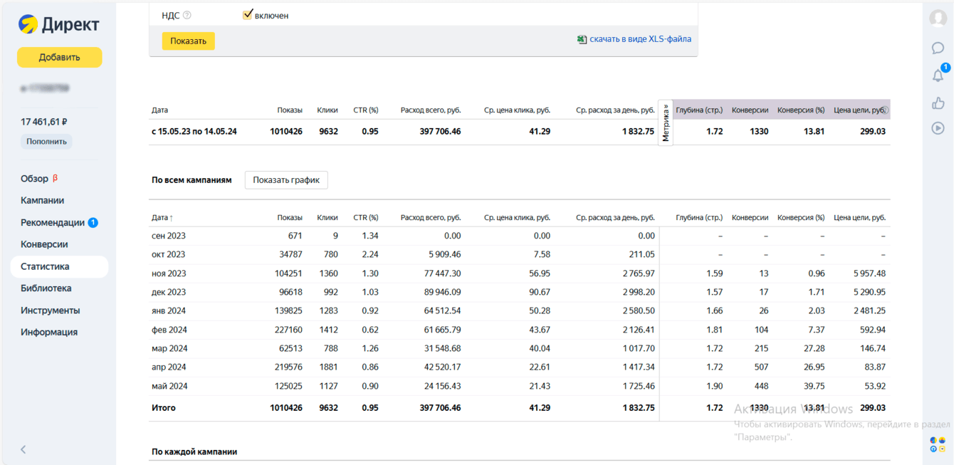 Ниже вы можете увидеть скриншот кабинета Яндекс.Директа за период работы на момент написания этого кейса: