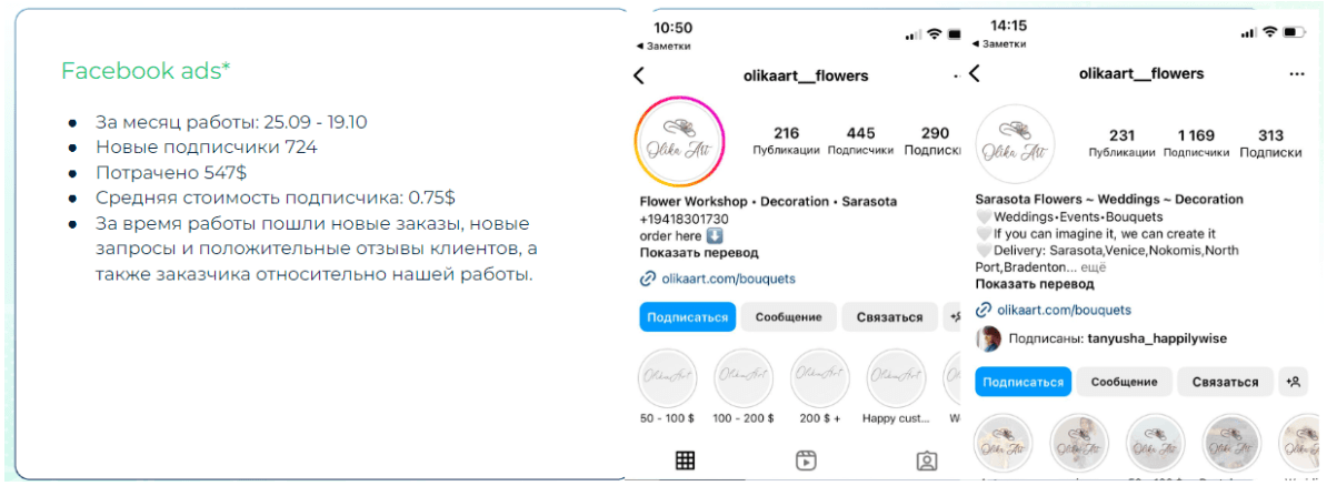 3. Доставка цветов в г. Сарасота (США). Продвижение велось исключительно на английском языке. Была проведена оптимизация Instagram*-аккаунта: изменены описание профиля и оформление актуальных сториз для повышения конверсии от рекламы. Основной целью кампании было увеличение числа подписчиков. По словам клиента, это привело к росту продаж: количество заказов увеличилось на 17 в месяц по сравнению с предыдущим периодом.