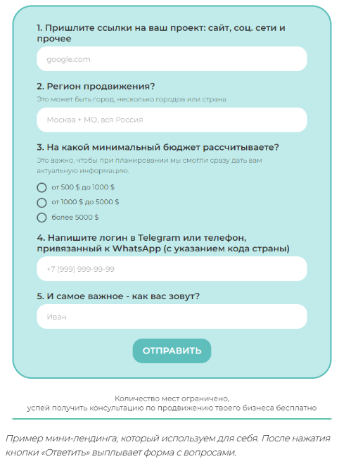 Идеальный вариант — мини-лендинг с формой для заявки. У людей нет времени изучать огромные сайты. Гораздо лучше работает простая просьба оставить заявку и ответить на пару вопросов. Рекомендую делать не больше 4–5 вопросов, иначе конверсия сильно падает. Но если хочешь отсеять ленивых, можешь сделать больше вопросов — тогда до тебя дойдут только самые целеустремленные ребята.