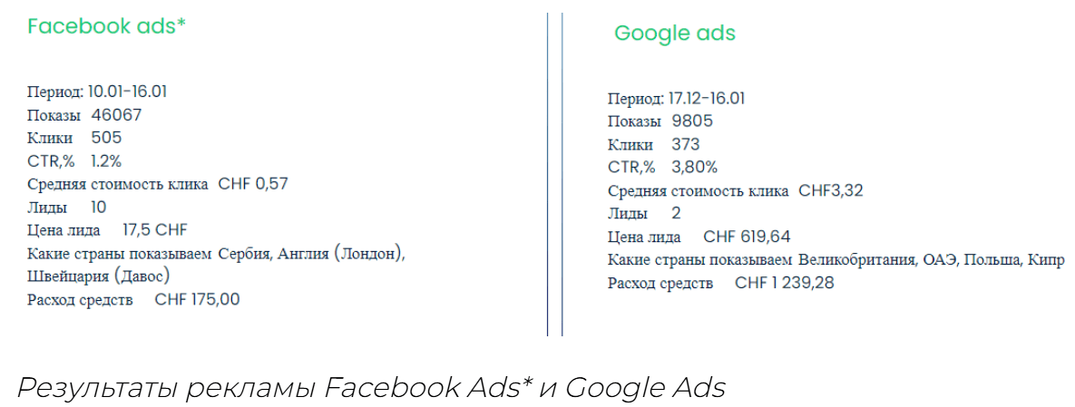 4. B2B-платежи в Европе (швейцарская платежная система). Изначально работа велась только через Google, так как клиент сомневался в эффективности Facebook* для B2B-сегмента из-за преобладания там B2C-аудитории. Однако мы настояли на тестовом запуске рекламы и в Facebook*. В итоге эта площадка принесла в три раза больше заявок, чем Google. При этом количество лидов, которые в итоге стали клиентами, оказалось примерно одинаковым с обоих каналов. Достигнутая стоимость заявки была оценена как очень хорошая для B2B-ниши.