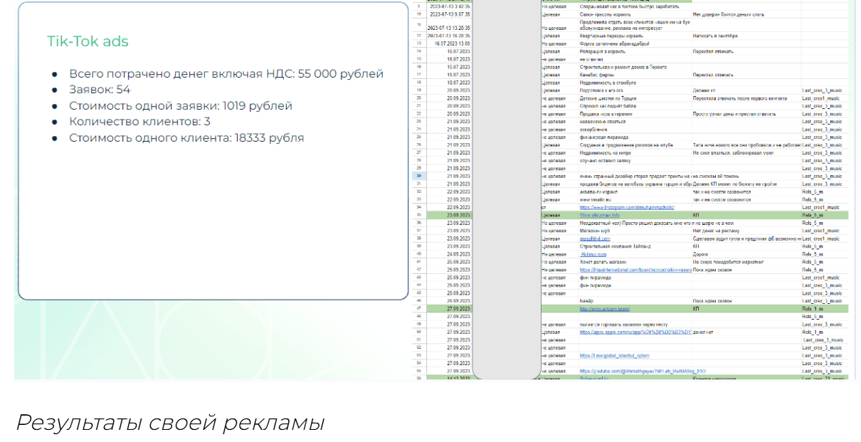 2. Продвижение SEO-услуг. Мы проводили тестирование рекламных кампаний на русском и английском языках, используя площадки TikTok Ads и Facebook Ads*. Кампания в TikTok показала следующие результаты: за месяц было привлечено 94 лида при общих затратах в $710. Стоимость одного лида составила $7,56, а цена за клик — $1,65.