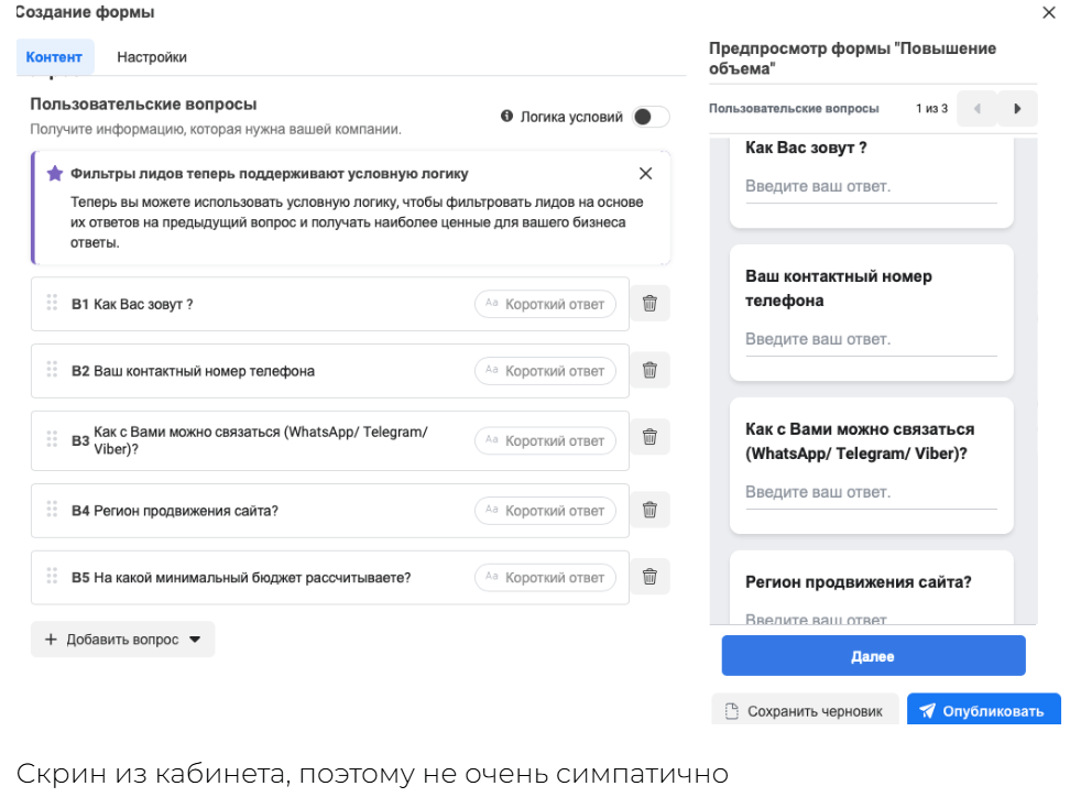 Это самый простой, но очень действенный способ. Люди заполняют её охотнее, потому что им лень переходить на сайт или в чат-бот. Форма всплывает прямо в рекламной системе. Но есть и большой минус: много нецелевых лидов. Люди случайно нажимают, оставляют номер, а потом не отвечают. Доля "мусорных" заявок может достигать 70%.
