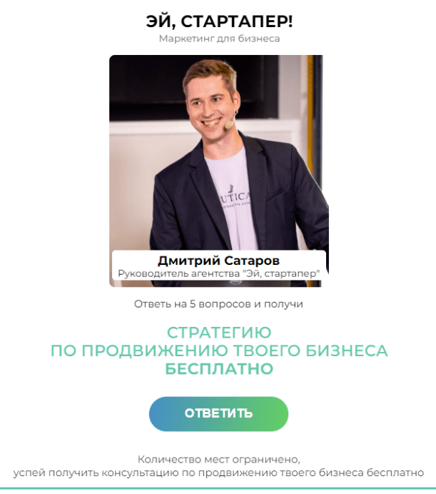 Идеальный вариант — мини-лендинг с формой для заявки. У людей нет времени изучать огромные сайты. Гораздо лучше работает простая просьба оставить заявку и ответить на пару вопросов. Рекомендую делать не больше 4–5 вопросов, иначе конверсия сильно падает. Но если хочешь отсеять ленивых, можешь сделать больше вопросов — тогда до тебя дойдут только самые целеустремленные ребята.