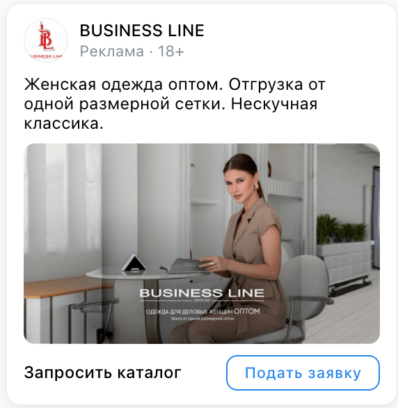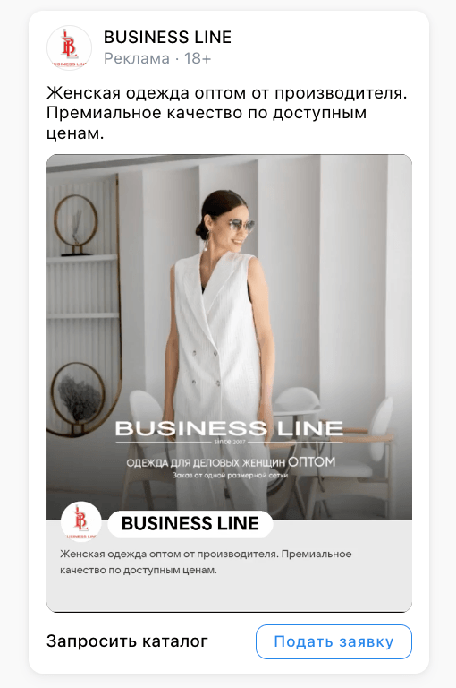 Наличие достойного лукбука, который можно было получить по запросу и принять решение о сотрудничестве, побудило специалистов Webit использовать лид-форму в качестве основного формата рекламы. В лид-форме можно разместить привлекательный креатив (образ из лукбука), call-to-action (“запросить каталог”) и анкету для заполнения контактов (“подать заявку”):