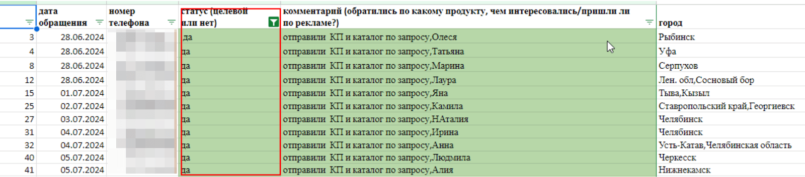 Качество заполненных заявок на лукбук может оценить только клиент. Поэтому при использовании лид-форм так важен постоянный контакт с клиентом, который будет давать оценку поступившим лидам. Мы создали документ, где клиент сообщал, целевой ли лид к нему зашел:
