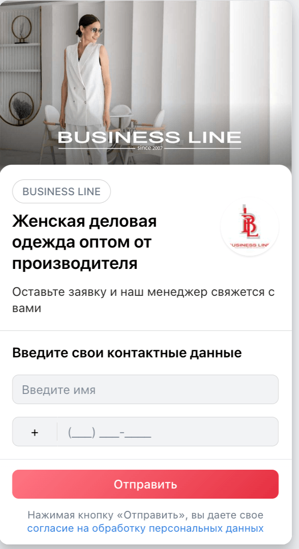 Наличие достойного лукбука, который можно было получить по запросу и принять решение о сотрудничестве, побудило специалистов Webit использовать лид-форму в качестве основного формата рекламы. В лид-форме можно разместить привлекательный креатив (образ из лукбука), call-to-action (“запросить каталог”) и анкету для заполнения контактов (“подать заявку”):