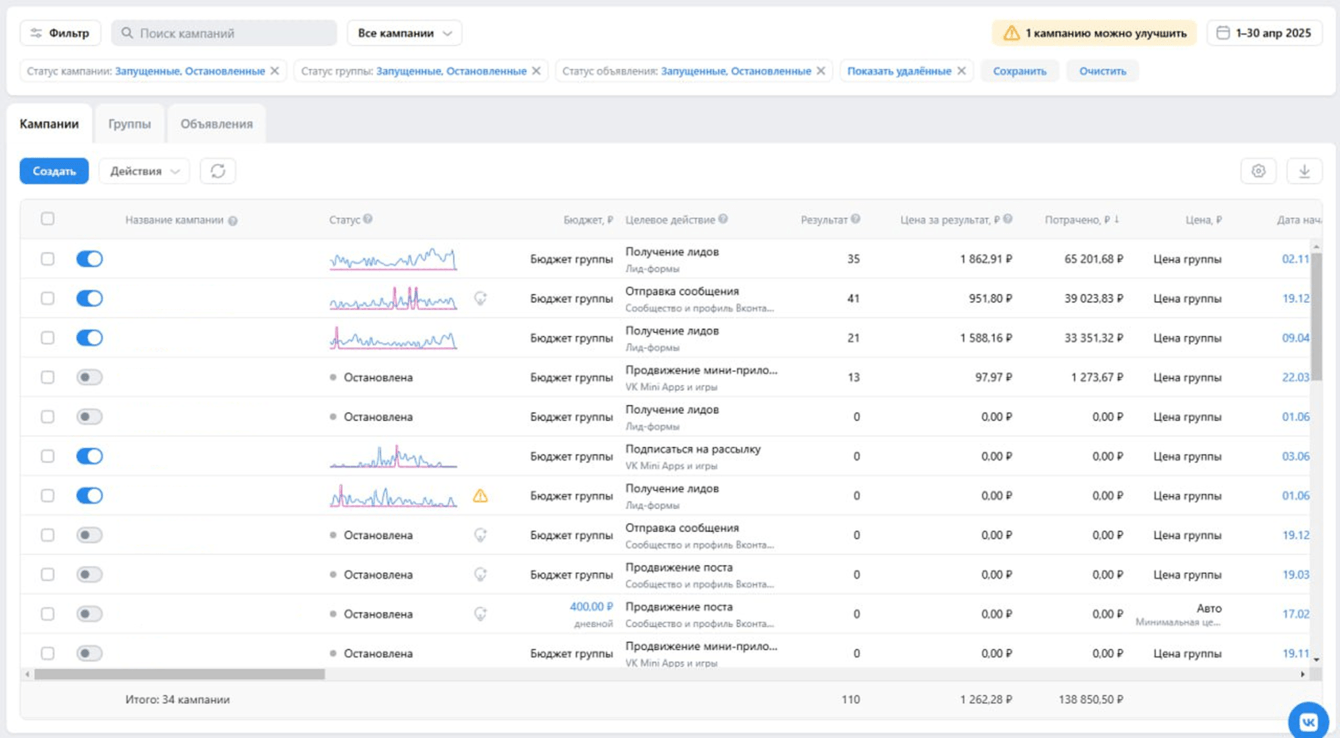Главный вывод — аудитория, подписанная на конкурентов и на группы по ремонту, в 2 раза чаще оставляла заявки, чем пользователи с широкими интересами вроде «дизайн интерьеров». Это тот случай, когда контекст важнее возраста и дохода.