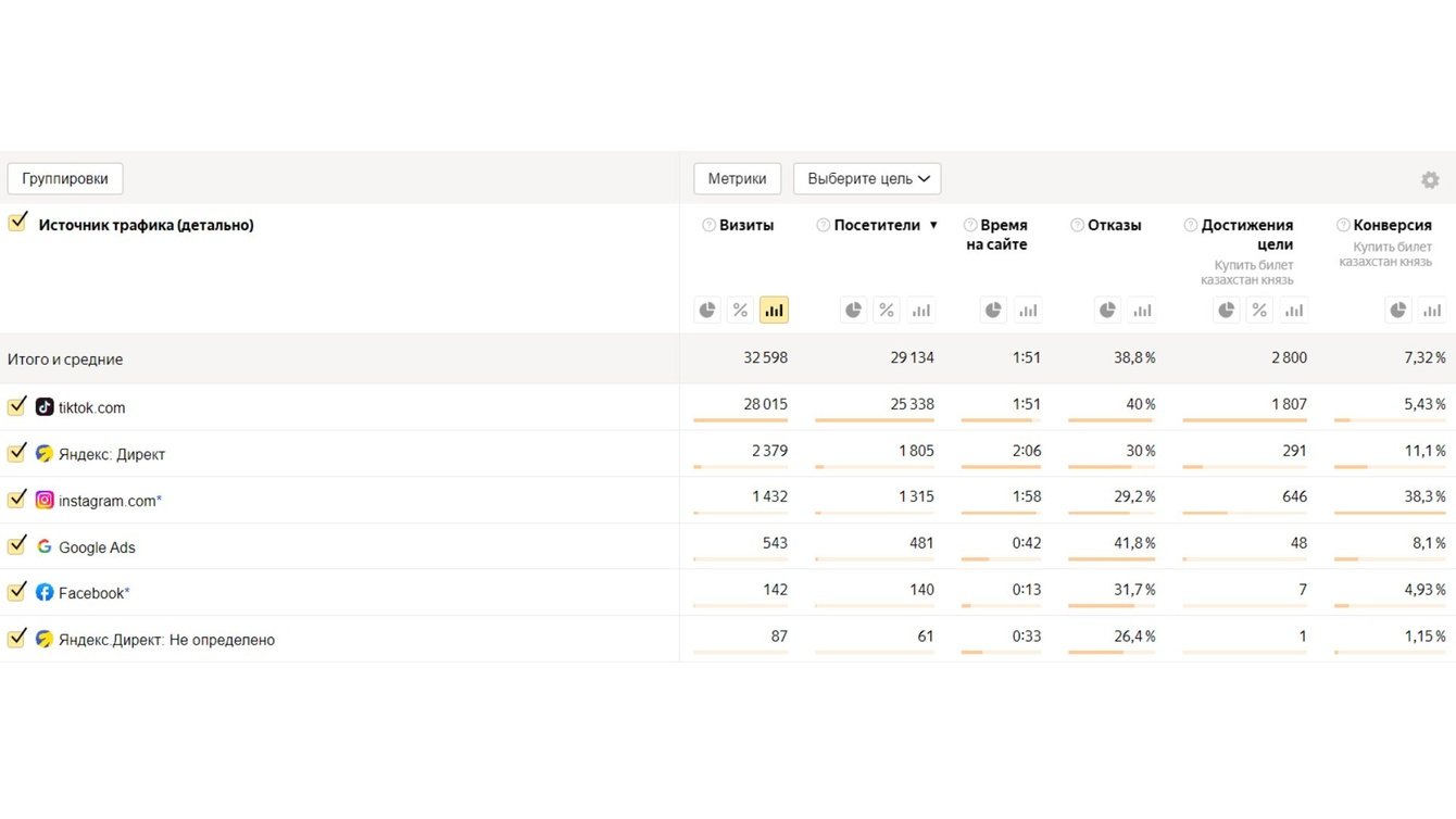 На примере этого кейса мы видим, что поведение пользователей с тик тока даже при настройке на конверсию уступает по показателям времени на сайте и отказам остальным видам трафика.
