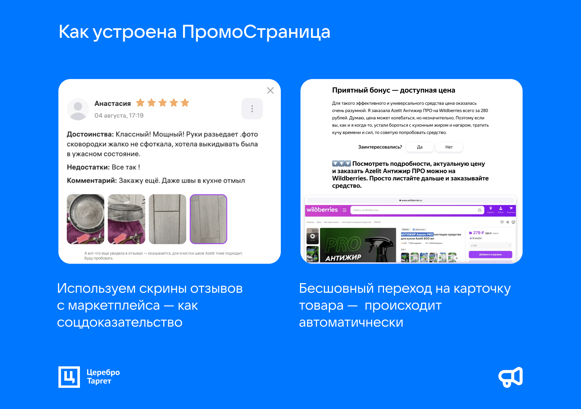 Механика работает на прогрев пользователя: человек скроллит статью, узнает о товаре, опыте использования, смотрит изображения. Дочитав до конца, происходит автоматический переход на карточку товара или сайт, где можно купить товар.