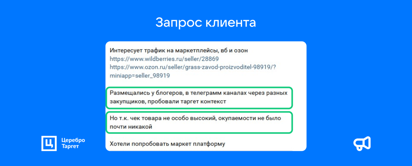 Клиент надеялся, что посевы ВК станут надежным источником трафика для маркетплейсов. Важно было учесть, что чек товаров ниже среднего. Чтобы достичь окупаемости для таких позиций, нужно много продаж. Соответственно, необходимы большой объем охватов и низкий CPC.