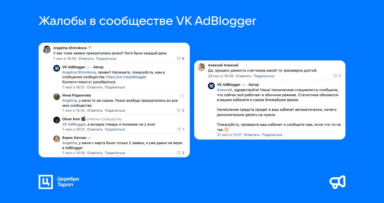 Поддержка утверждает, что по их показателям с охватами и CPM нет проблем. Более того, они ссылаются на недостаточно цепляющие креативы или неправильные подборки сообществ.