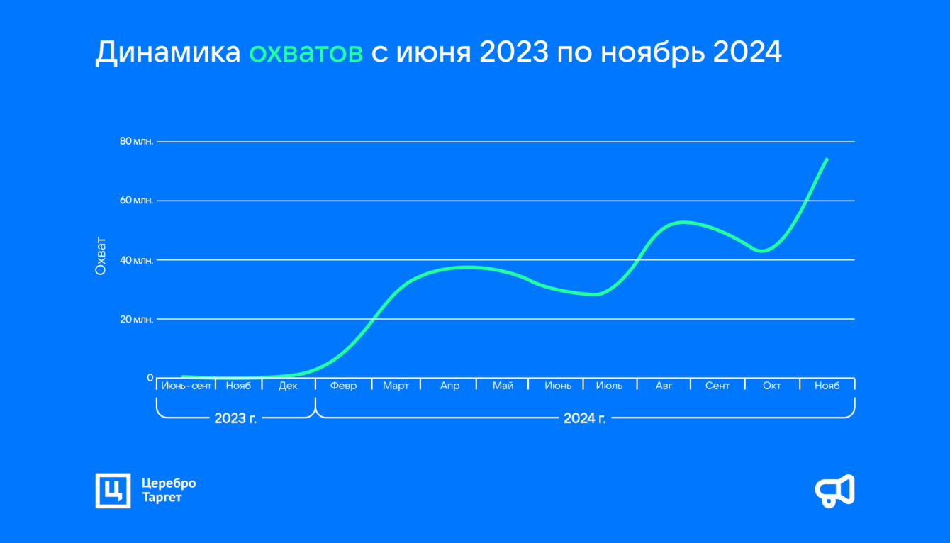 В 2024 году с одного-двух товаров вышли на ежемесячное продвижение 6-10 позиций. Также клиент увеличил бюджет в 10 раз, что дало пропорциональный буст количеству кликов. А охваты в среднем за год выросли в 100 раз.