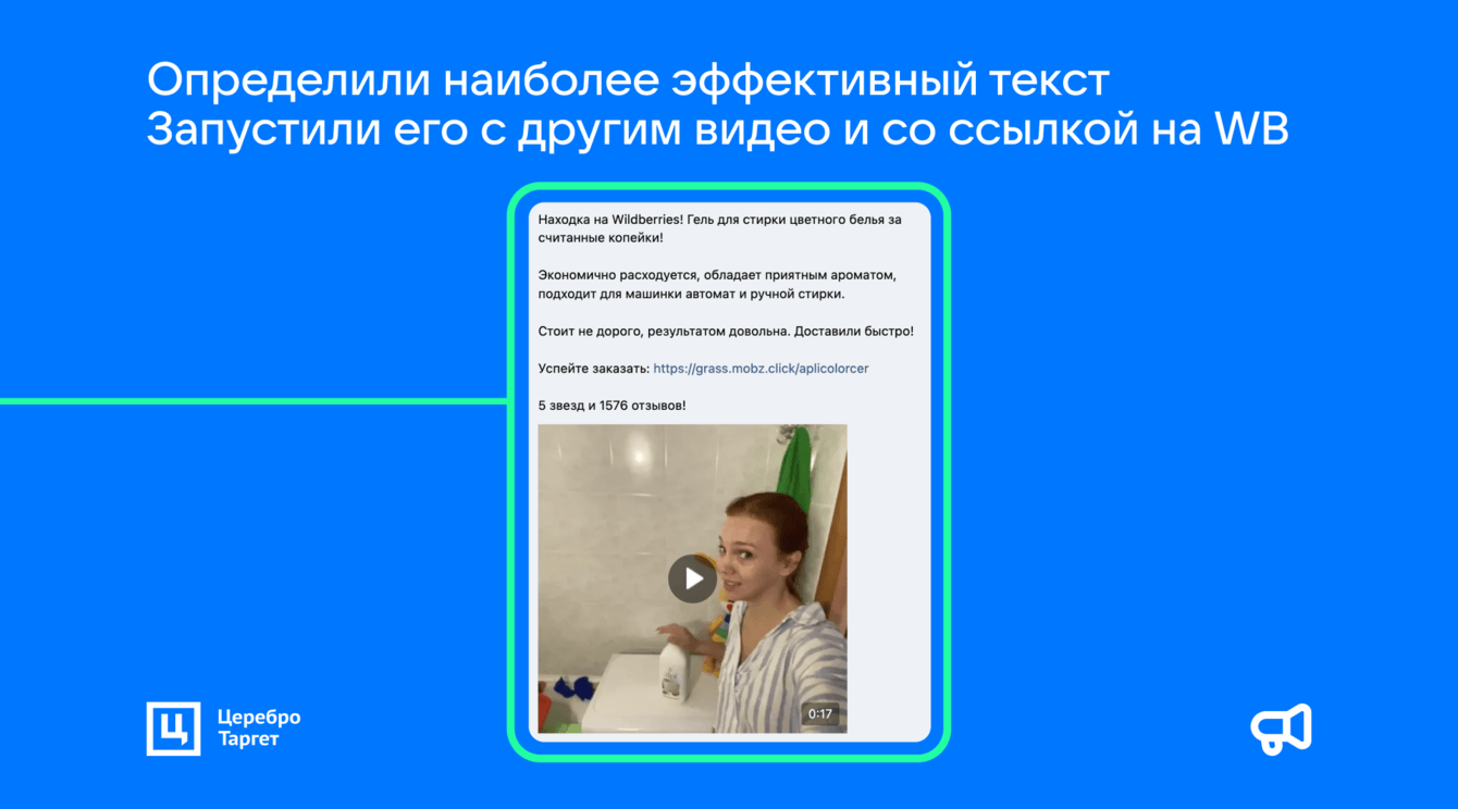 Всего тестировали 4 креатива. Сначала вели трафик на Ozon, так как там проще работать с внутренней статистикой. Но позже переключились на WB и поменяли видео.