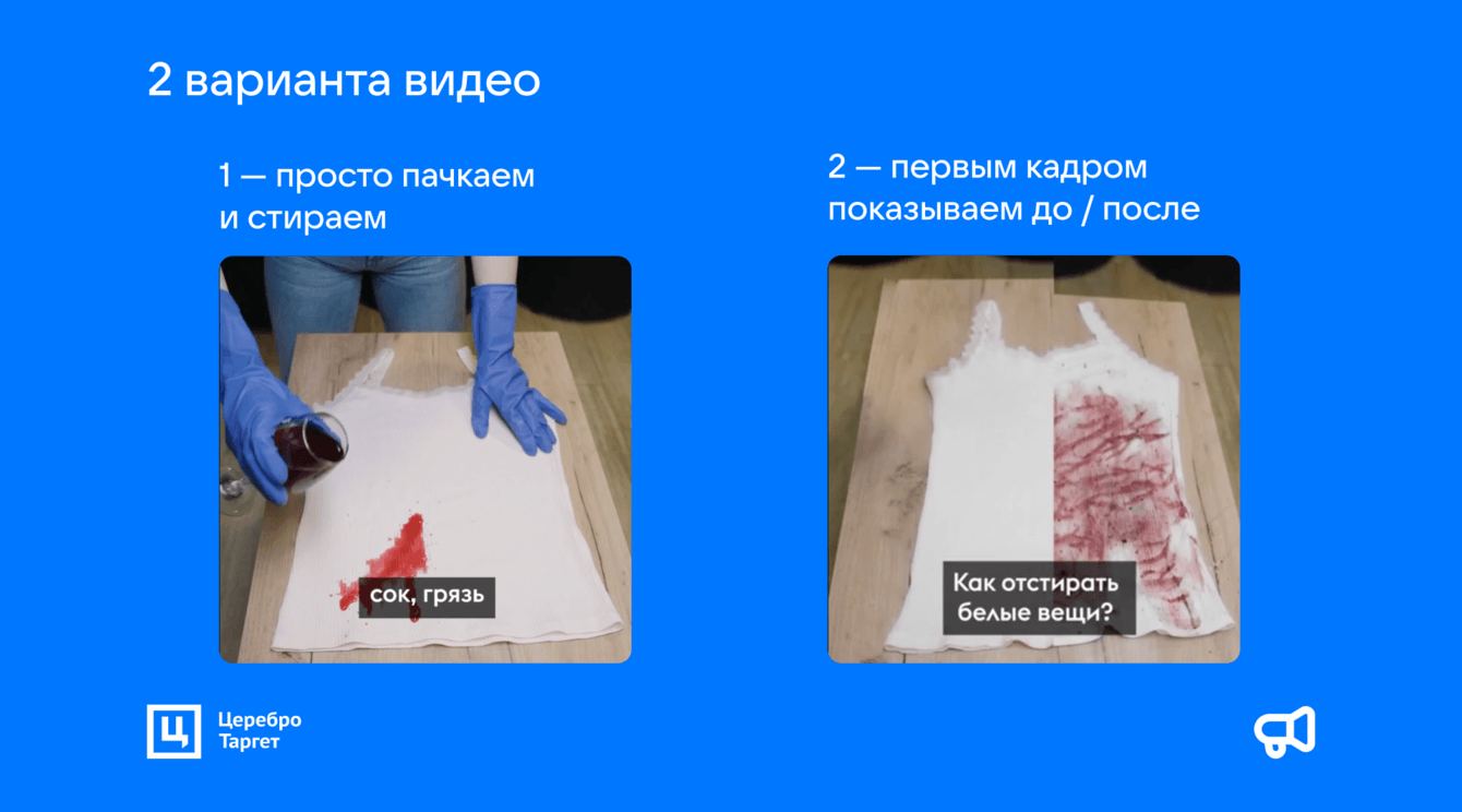 Нанесли на белую майку пачкающие жидкости — сок, масло, кетчуп. Затем постирали вещь с гелем и показали идеальный результат. Причем тестировали два варианта этого видео: в одном — сразу пачкаем вещь, во втором — сперва показываем кадр до и после.