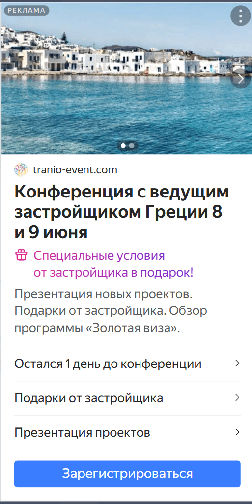 Начали мы постепенно и первое мероприятие, с которого мы стартовали — это офлайн-конференция с презентацией проектов от застройщика Греции. Задача: привлечь посетителей на конференцию для роста продаж зарубежной недвижимости. Участие в конференции бесплатное.