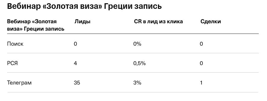 После вебинара у клиента состоялась сделка от рекламы в РСЯ. Стоит отметить, что сумма сделки в отрасли очень крупная и с лихвой покрывает вложения в рекламу. В результате продажи записи вебинара также состоялась сделка. Инструмент эффективно сработал на аудиторию, которая еще не была готова к решению, но заинтересована в продукте.