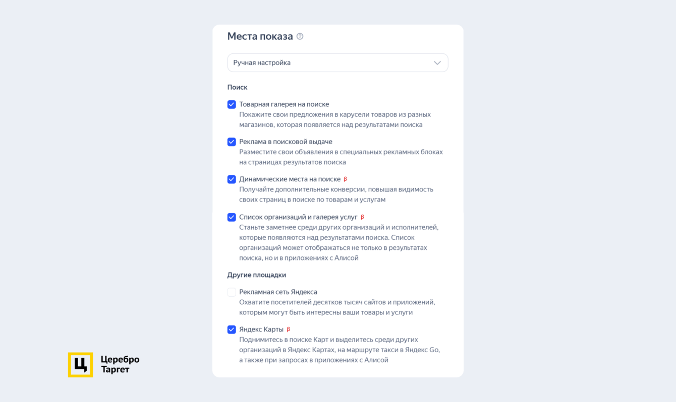 Выбрали место показов. Объявления будут отображаться в товарной галерее, поисковой выдаче, динамических местах и на Яндекс Картах.