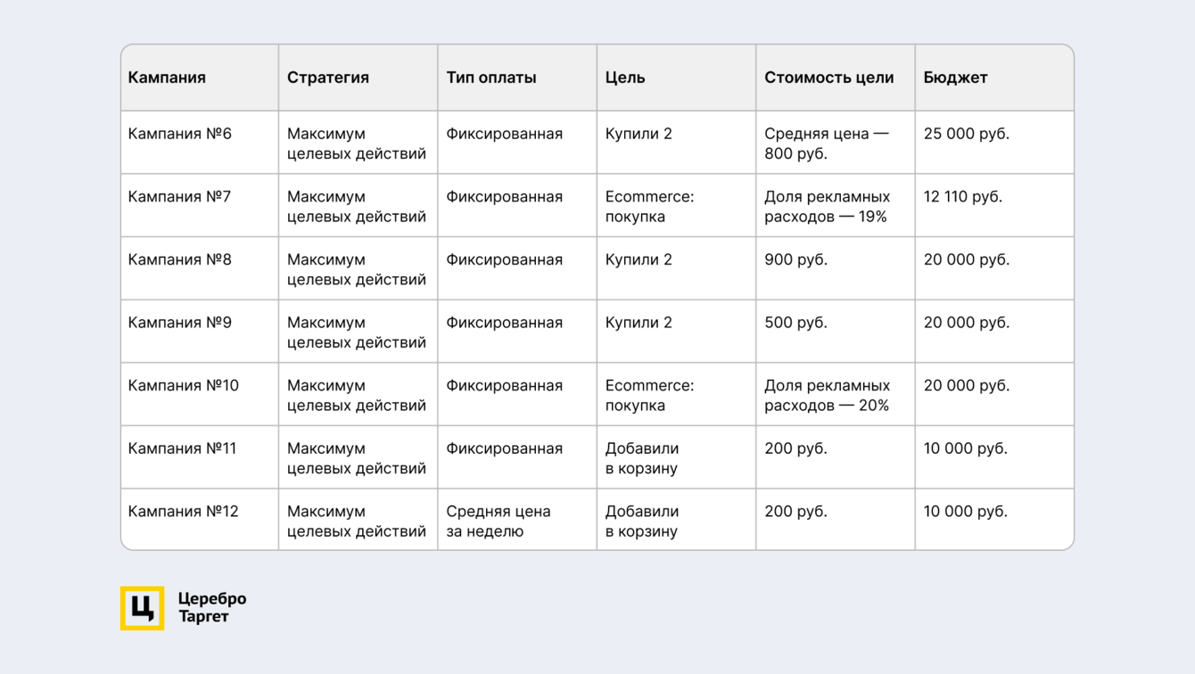 Самая низкая цена продажи — в товарных кампаниях. Поэтому создали несколько новых кампаний с разными стратегиями, целями, ценами и разным недельным бюджетом чтобы эффективно распределить между ними трафик. За полгода продвижения появилось 7 товарных кампаний. Подробные настройки — в таблице.