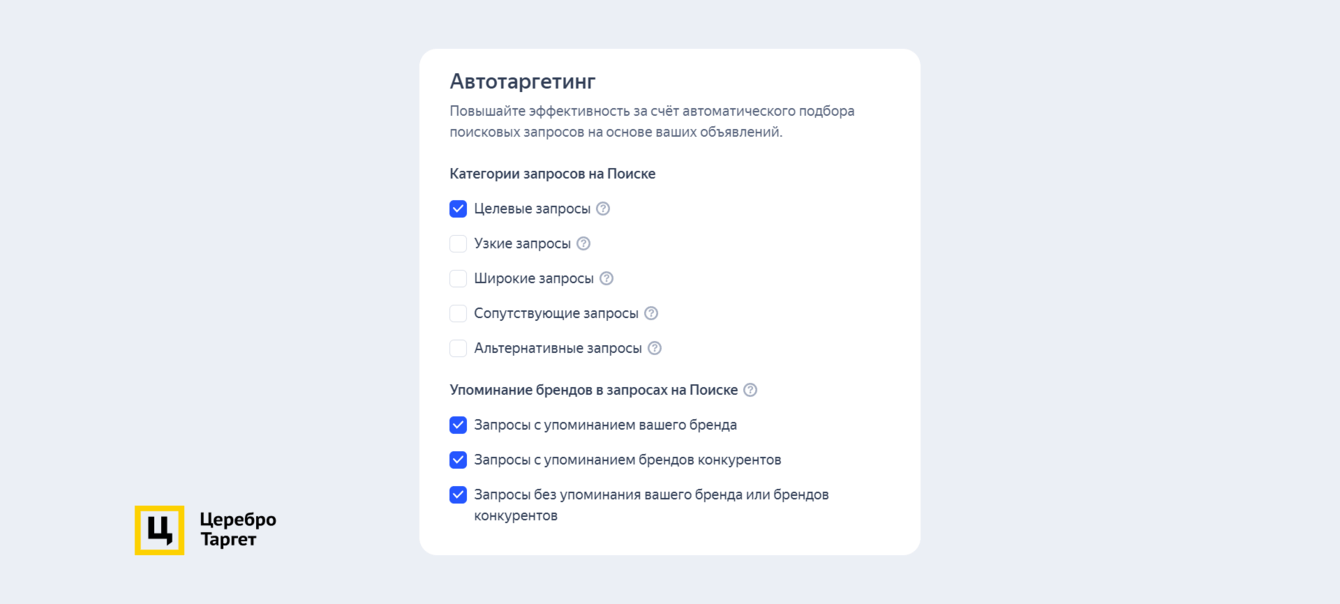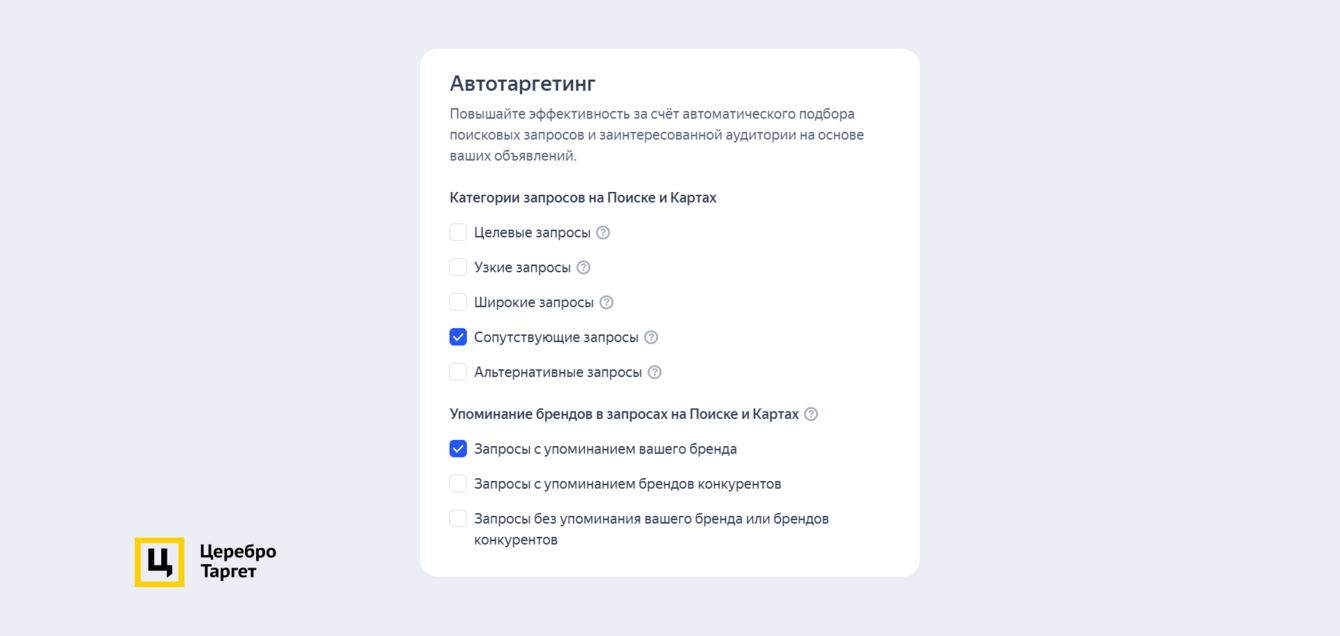 Настроили таргетинги. Автотаргет настроили по сопутствующим и брендовым запросам, чтобы охватить широкую аудиторию.