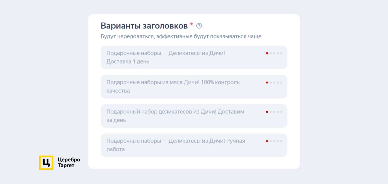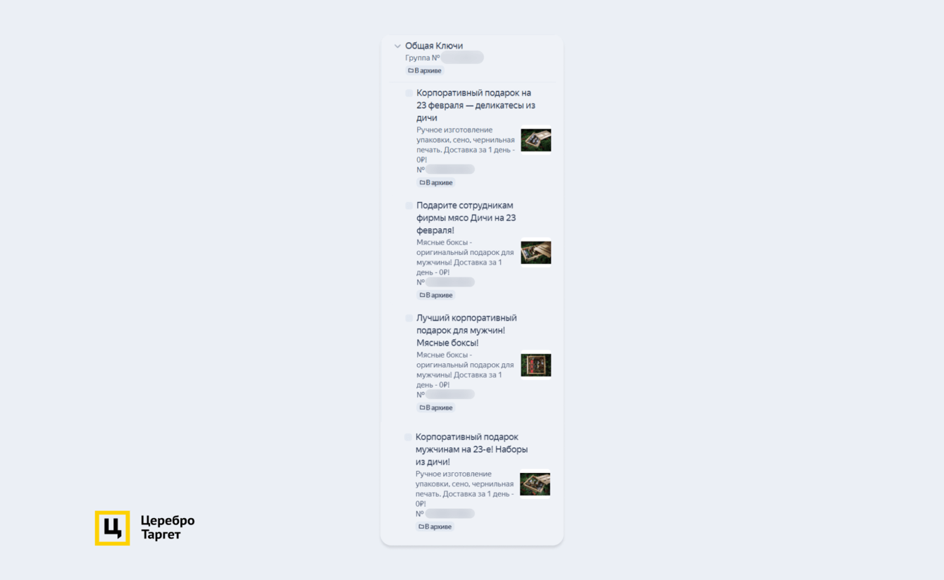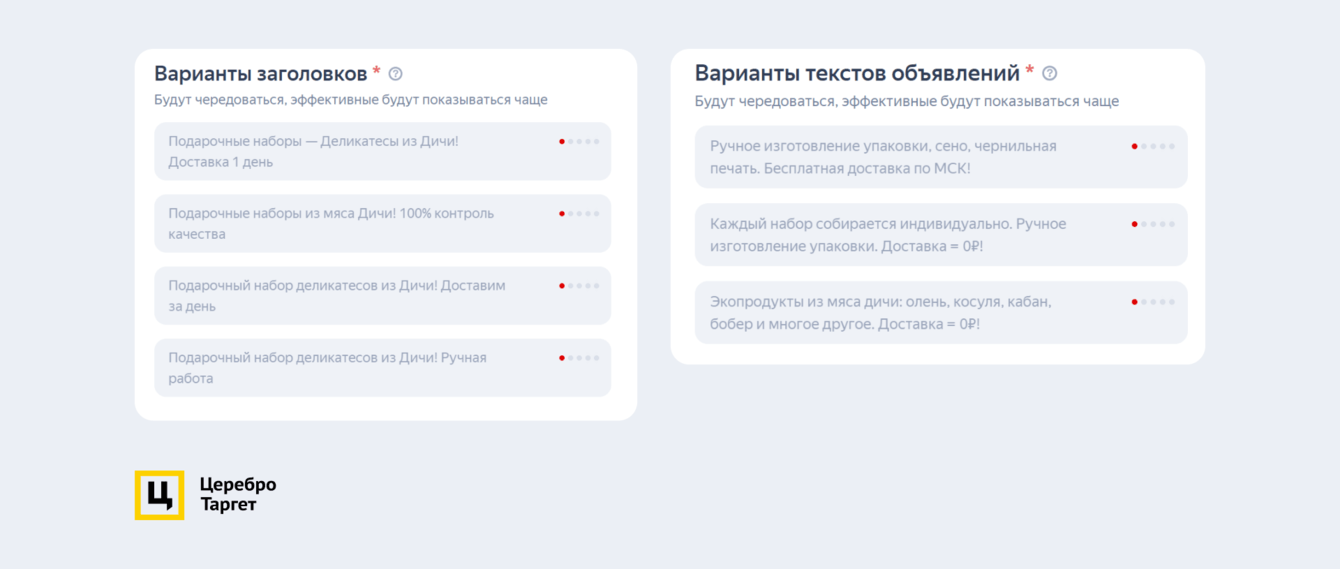 Заголовки генерировались автоматически, а описание к карточке подтягивалось либо с сайта, либо из кабинета: «Подарочный набор деликатесов из мяса Дичи! Доставим за день». Настройки таргетинга ничем не отличались от остальных ЕПК.