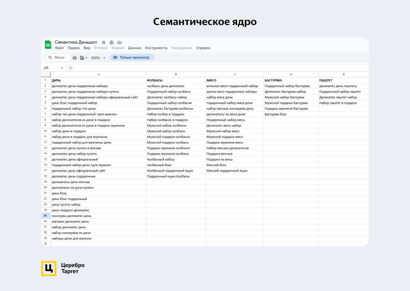 Взяли за основу прошлую семантику и немного дополнили ее. Ключевые фразы разбили на 5 групп, которые соответствовали категориям товаров на сайте интернет-магазина: дичь, колбасы, мясо, бастурма, паштет.