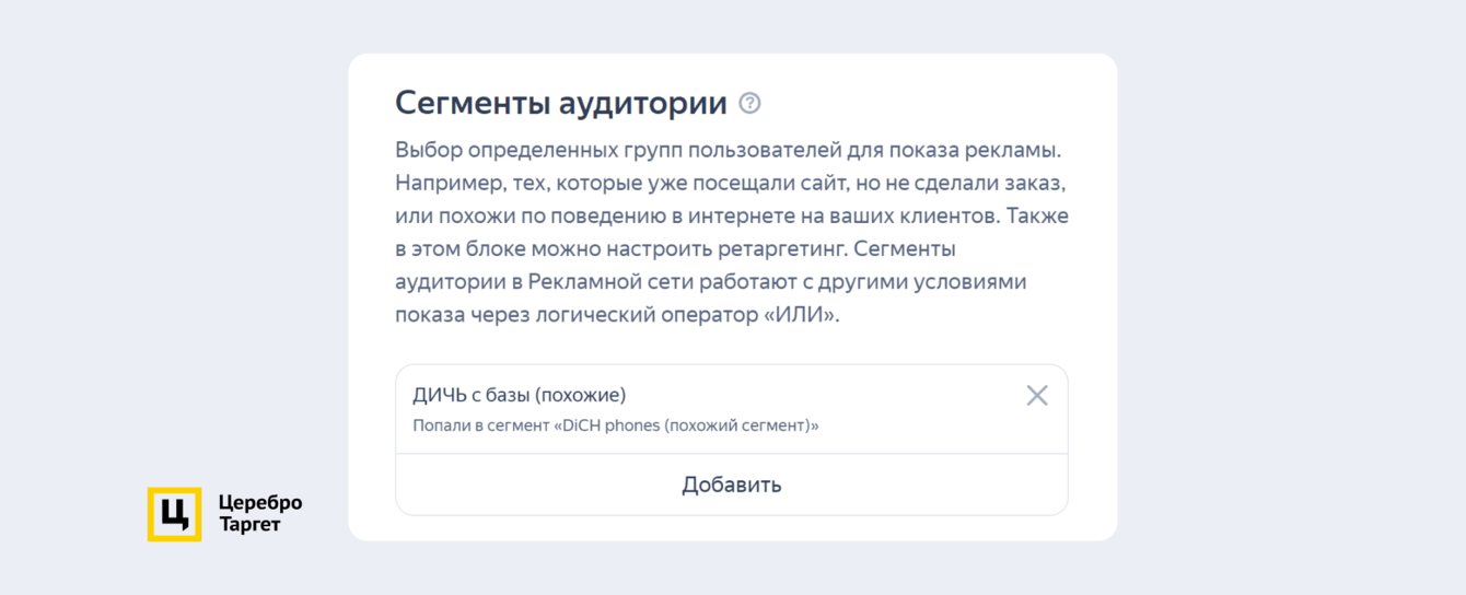 Мы загрузили базу в «Яндекс Аудитории» и создали сегмент «похожие». Таким образом получится протестировать таргет на пользователей похожих на тех, кто уже взаимодействовал с DICHSHOP.