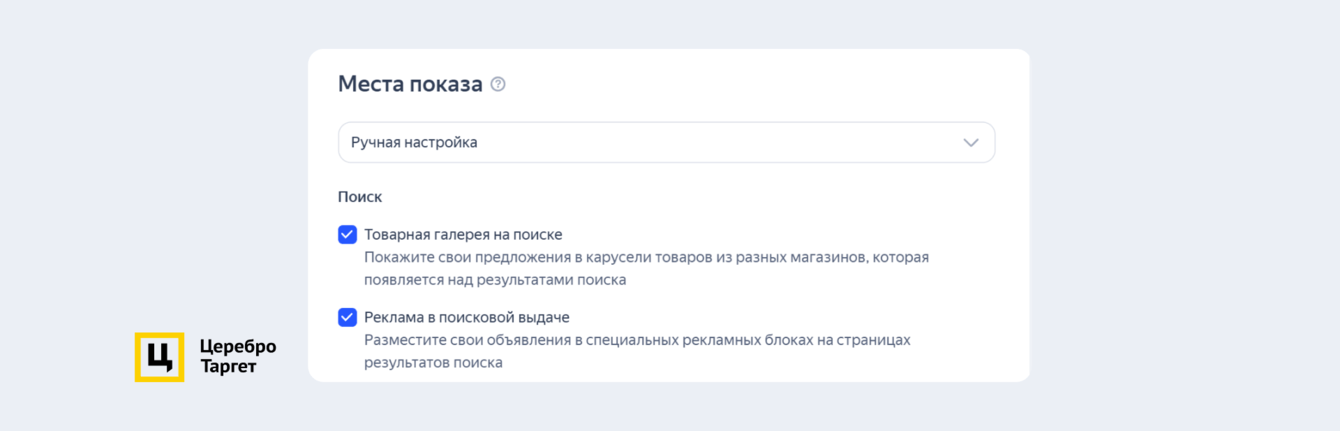 Выбрали место показов. Объявления будут транслироваться в товарной галерее и поисковой выдаче.