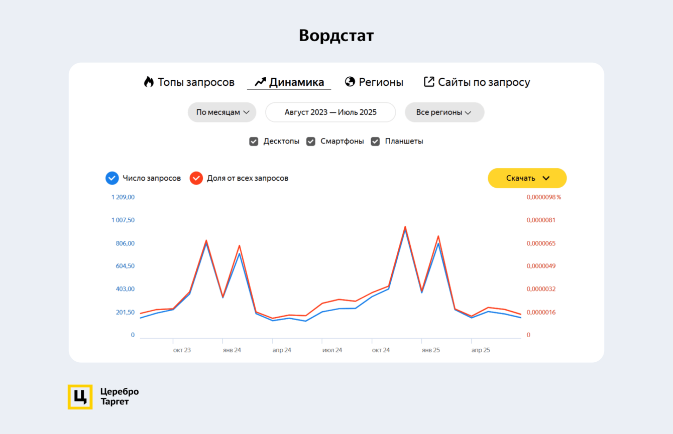 По статистике в Вордстат видно, что пиковые значения приходятся на декабрь и февраль в связи с праздниками: Новый год и 23 февраля. Это говорит о выраженной сезонности.