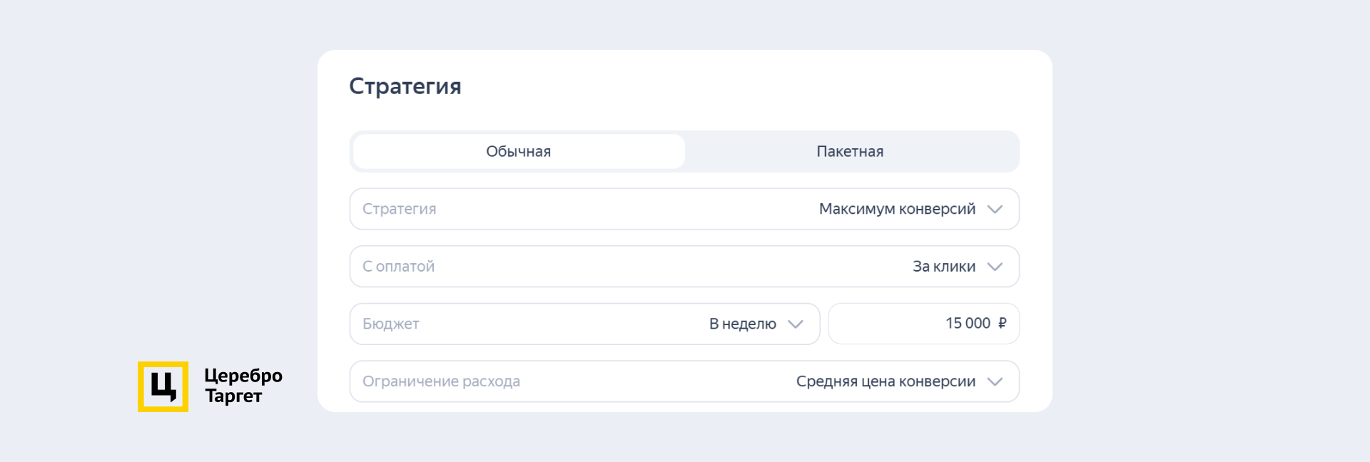 Оплата будет идти за клики, а ограничение будет по средней стоимости конверсии — 600 руб. Бюджет на неделю — 15 000 руб.