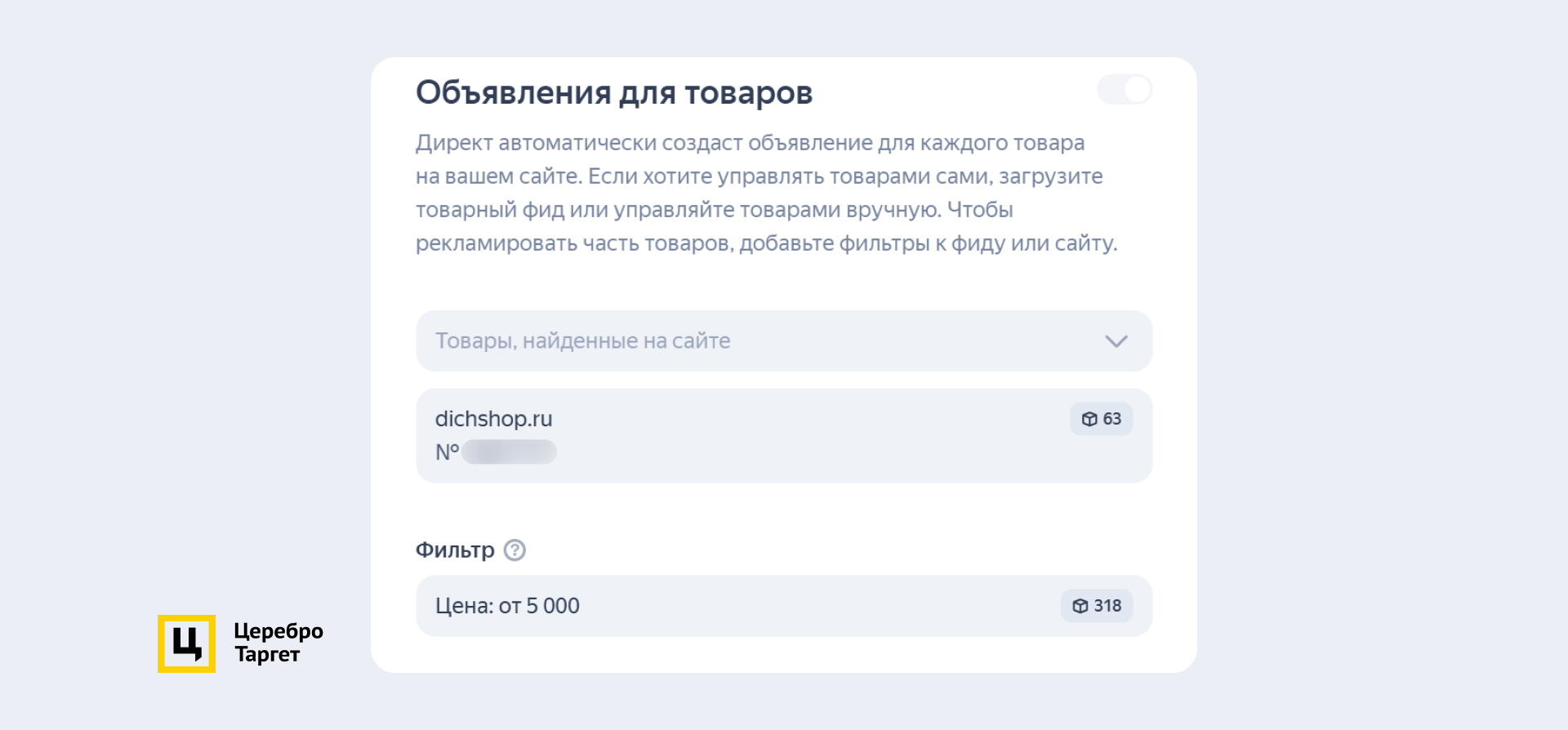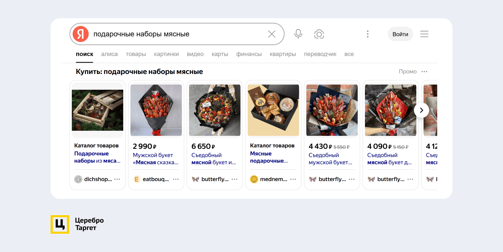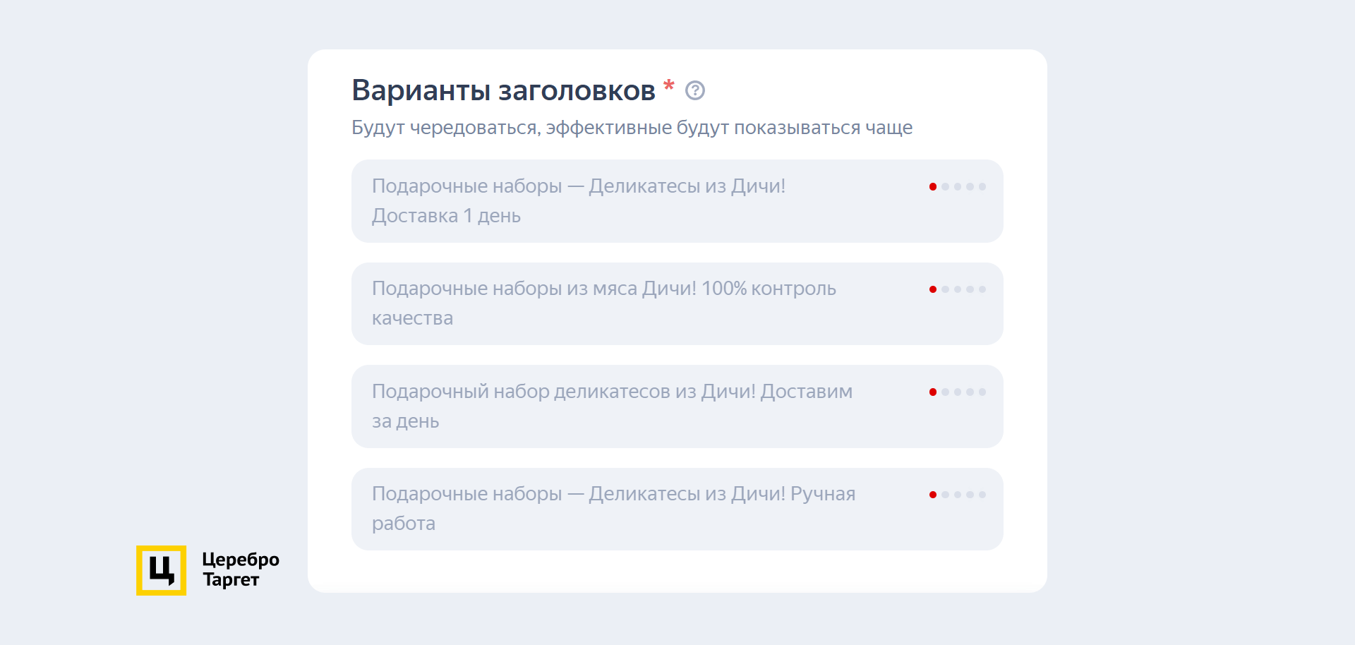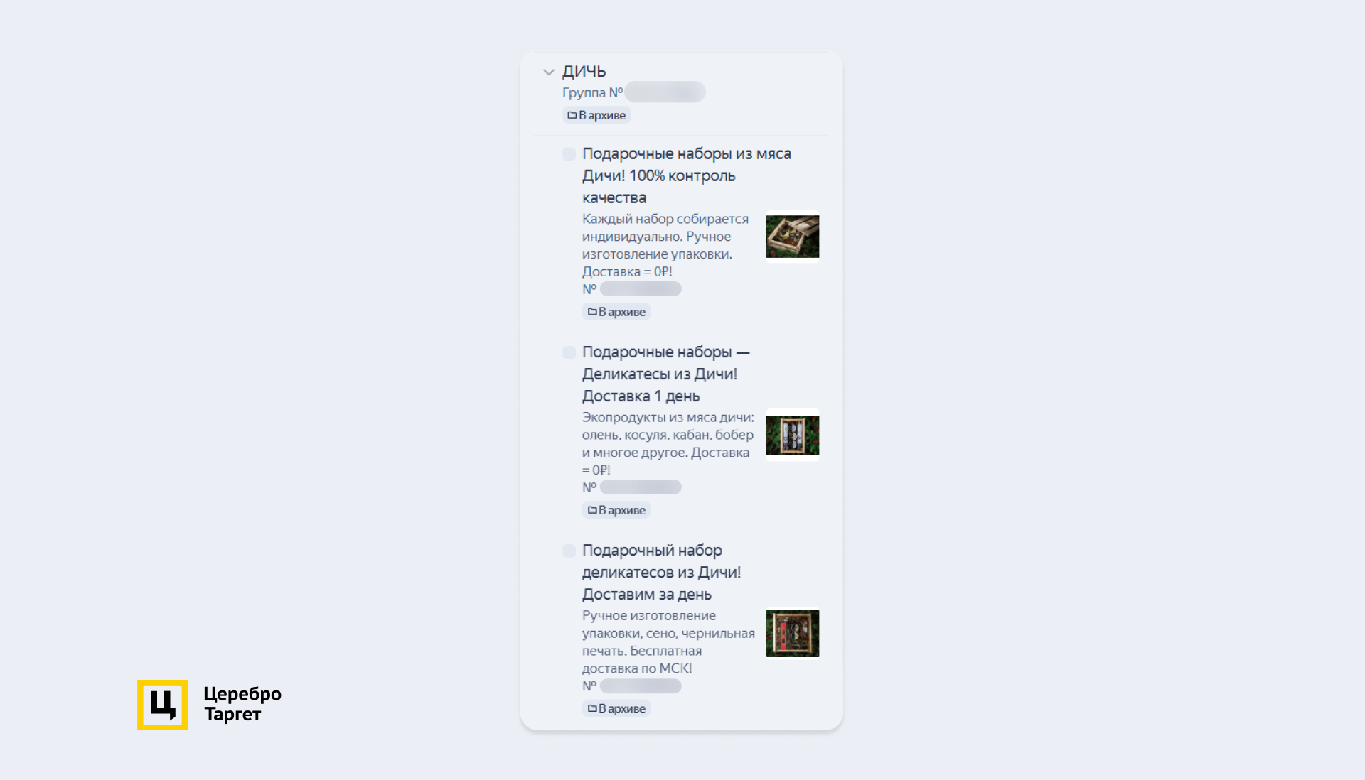 Заголовки генерировались автоматически, а описание к карточке подтягивалось либо с сайта, либо из кабинета: «Подарочный набор деликатесов из мяса Дичи! Доставим за день». Настройки таргетинга ничем не отличались от остальных ЕПК.