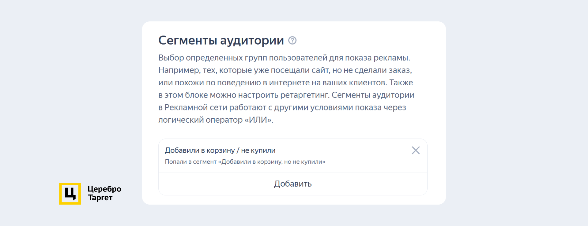 Напомним, что во время теста кампанию №3 обучали на цель «Добавление в корзину». Благодаря этому у нас собралась база теплых пользователей, которые уже интересовались товарами и на них можно было настроить таргет. Для этого создали сегмент в Яндекс Метрике: «добавили в корзину, но не купили» и внесли его в новую кампанию.