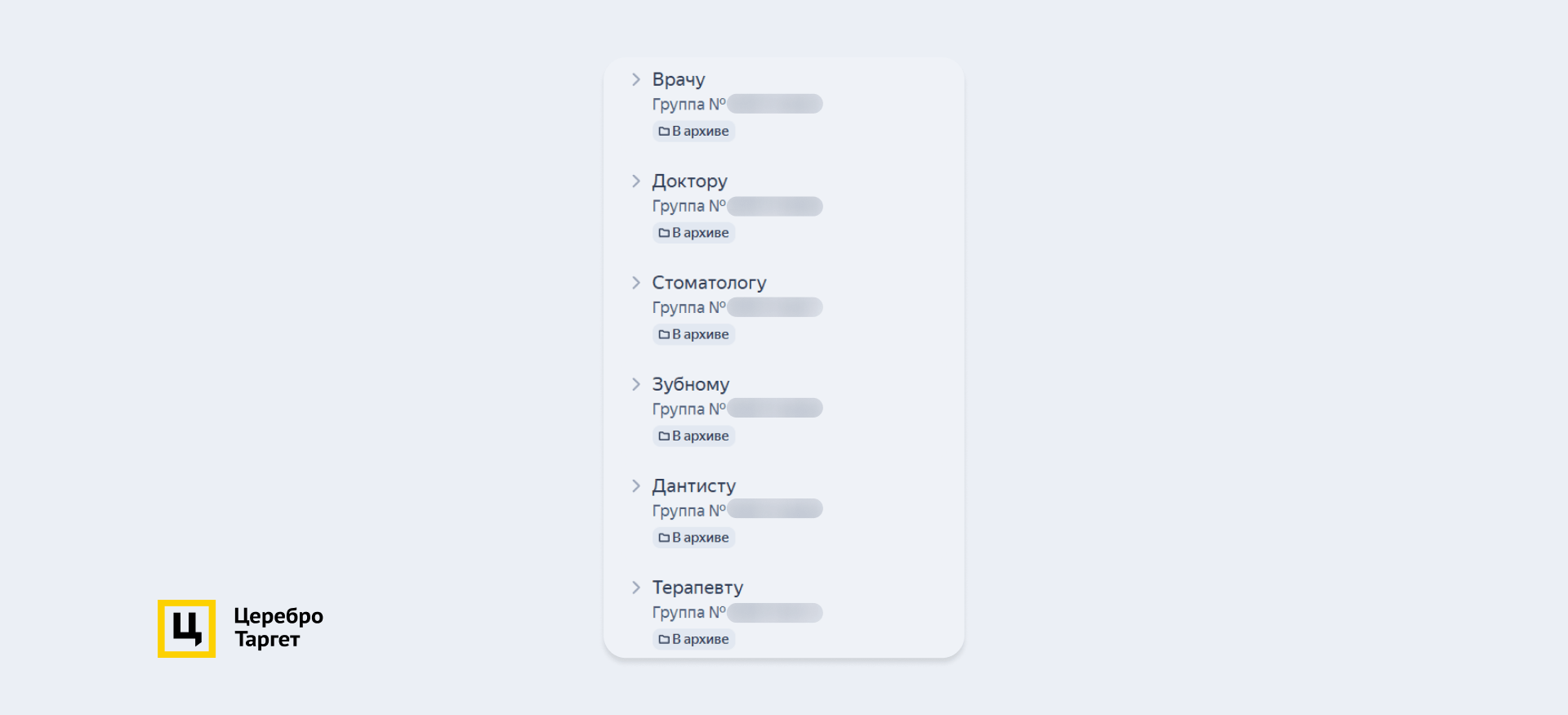 Создали несколько объявлений и объединили их в группы под разные специализации врачей: терапевт, стоматолог, хирург и т.п.