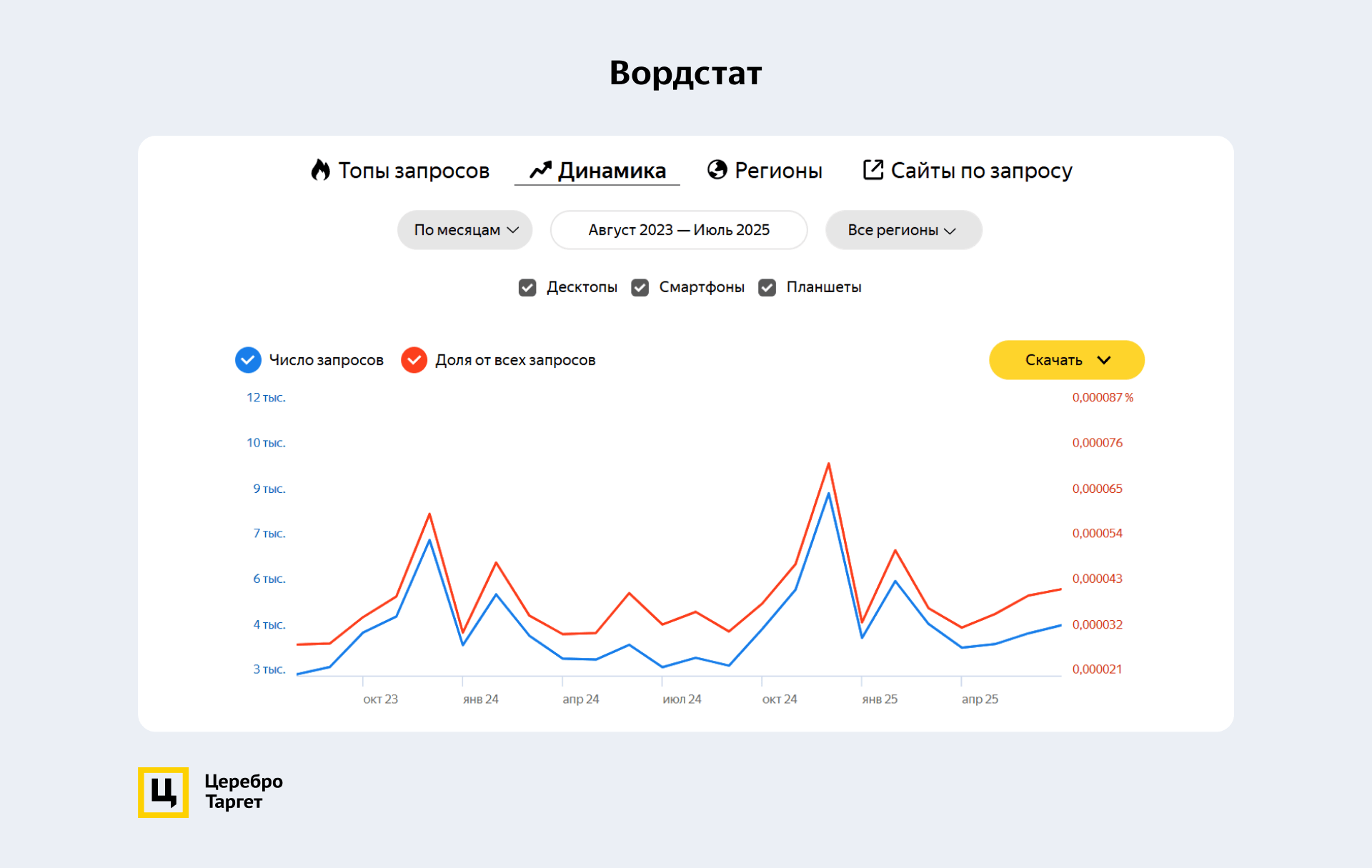 По статистике в Вордстат видно, что пиковые значения приходятся на декабрь и февраль в связи с праздниками: Новый год и 23 февраля. Это говорит о выраженной сезонности.