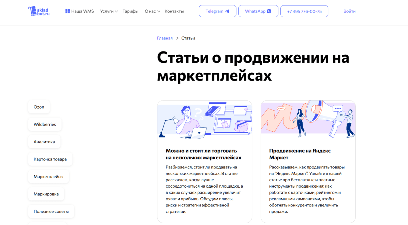 Работа с блогом требовала от нас максимального погружения в специфику маркетплейсов. Сложнее оказалось готовить материалы, где нужны были актуальные требования Ozon и Wildberries и скриншоты из личных кабинетов селлеров. Мы подписывались на официальные каналы, привлекали знакомых продавцов и просили команду Skladbot показывать интерфейсы на созвонах.