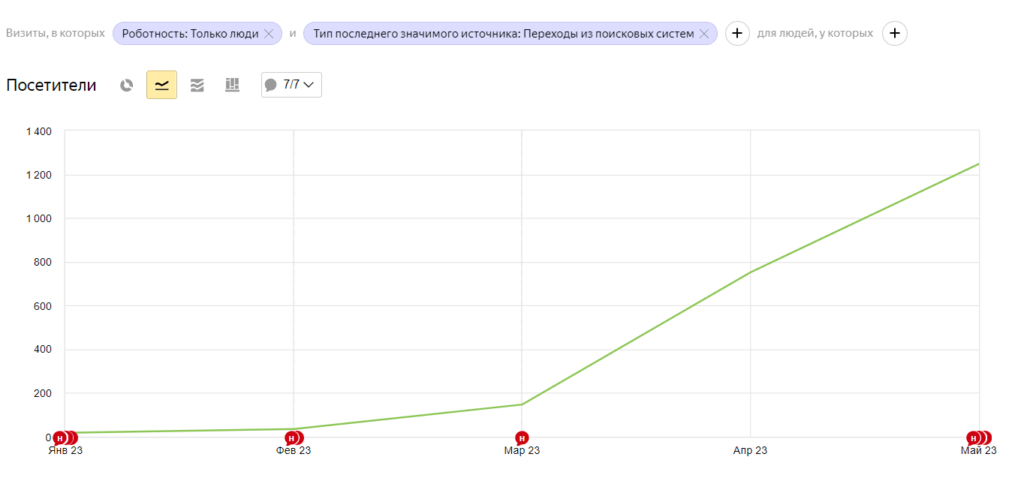 Через четыре месяца сайт уже вышел в топ-10 Google и «Яндекса» по ряду коммерческих и информационных запросов. Это обеспечило приток ЦА: в мае 2023-ого года сайт имел более 1200 пользователей ежемесячно. А наш заказчик отметил ощутимое увеличение числа целевых лидов именно с SEO-канала.