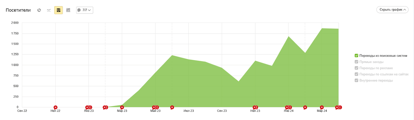 Через несколько недель мы провели повторный аудит уже индексируемого сайта. Важно было отследить мусорные страницы, не допустив их попадания в индекс, и наоборот, проверить индексацию нужных страниц. В «Яндексе» таких проблем почти не возникало, для Google дополнительно был подключен Indexing API. Одновременно мы дорабатывали блоки на коммерческих страницах и при необходимости расширяли тексты. Также была настроена микроразметка и запустилась работа по внешней оптимизации.