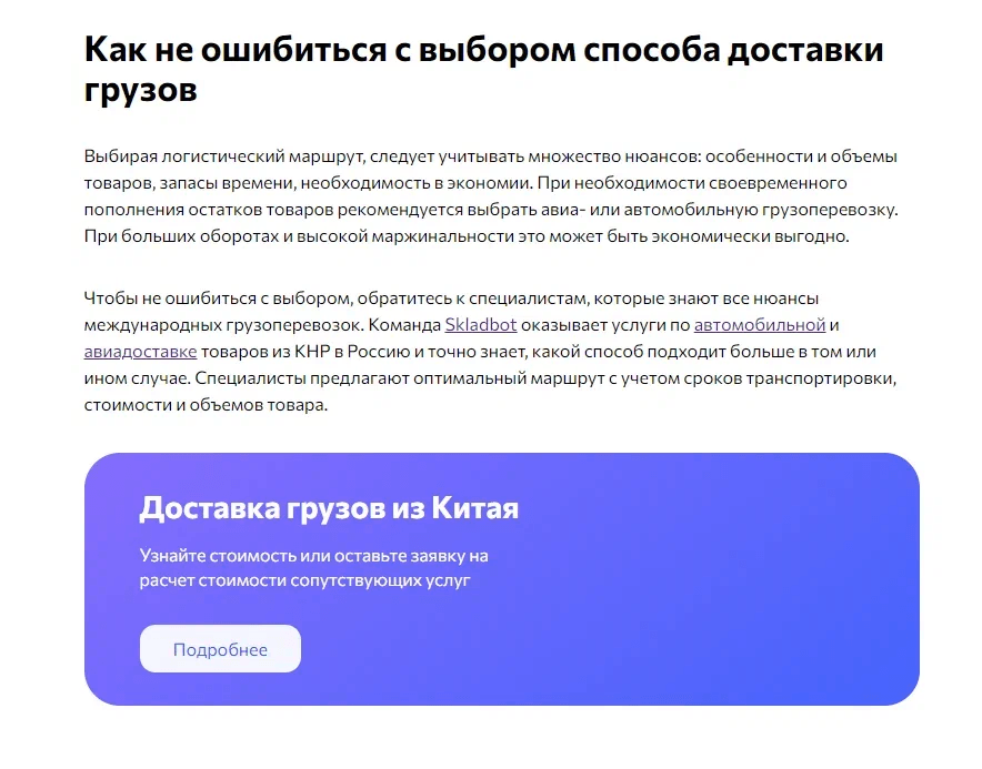 Из важных элементов оформления статей также стоит отметить кликабельный блок с содержанием и блок-врезку для обращения к команде Skladbot. А для большей конверсии мы активно добавляли в материалы еще и ссылки на страницы услуг.