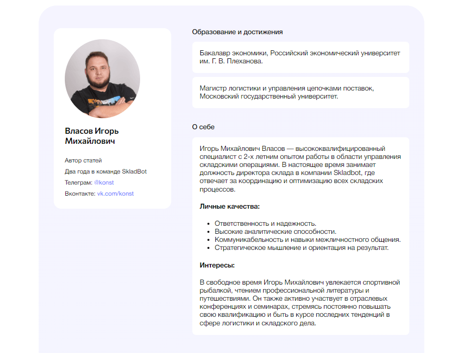 Для вовлеченности пользователей мы прикрутили к статьям возможность комментирования, а чтобы материалы были более экспертными, сделали карточки авторов. Каждая статья выходила от имени кого-то из членов команды Skladbot.